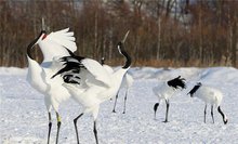 丹顶鹤(学名:Grus japonensis)是鹤类中的一种,大型涉禽,体长120~160厘米。颈、脚较长,通体大多白色,头顶鲜红色,喉和颈黑色,耳至头枕白色,脚黑色,站立时颈、尾部飞羽和脚黑色,头顶...