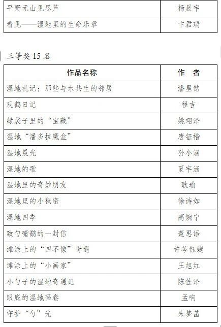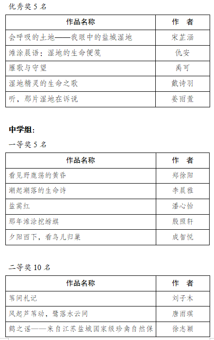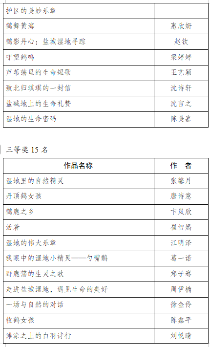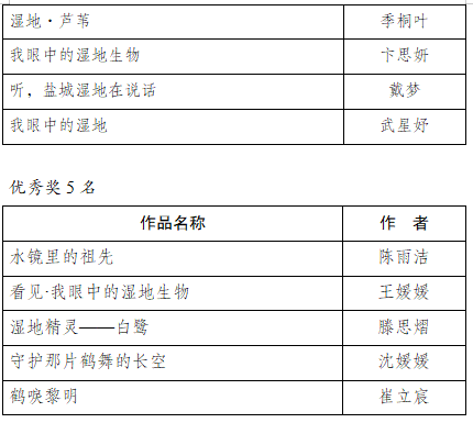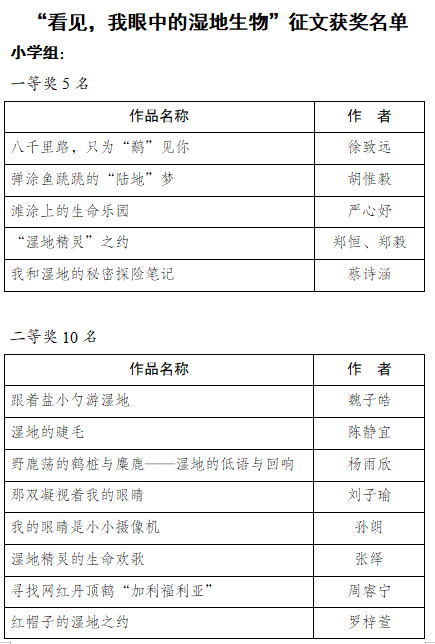 由盐城市湿地和世界自然遗产保护管理中心、共青团盐城市委员会主办,盐城黄海湿地文学创作中心承办的“看见·我眼中的湿地生物”主题征文活动现已结束。依据评审办法,分别评选出小学组、中学组各一等奖5名、二等奖10名、三等奖15名、优秀奖5名。现将获奖名单予以公布(附后),并对获奖作品、优秀作品颁发证书,以资鼓励。