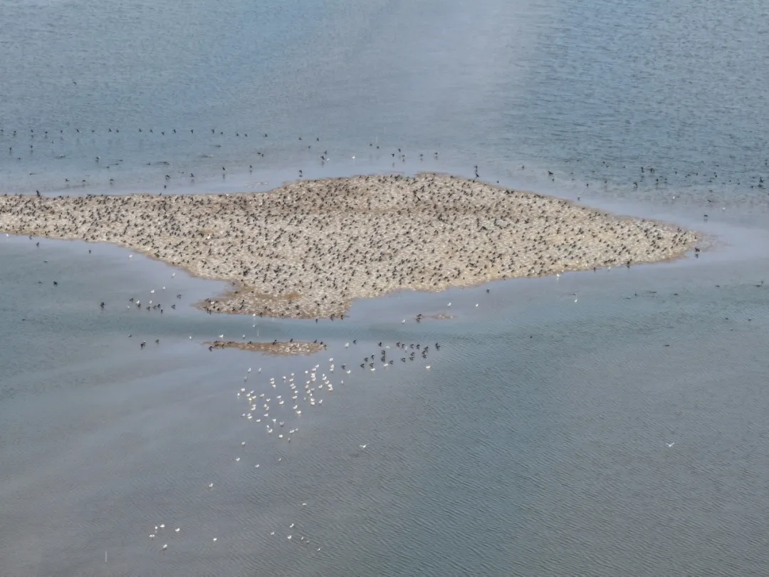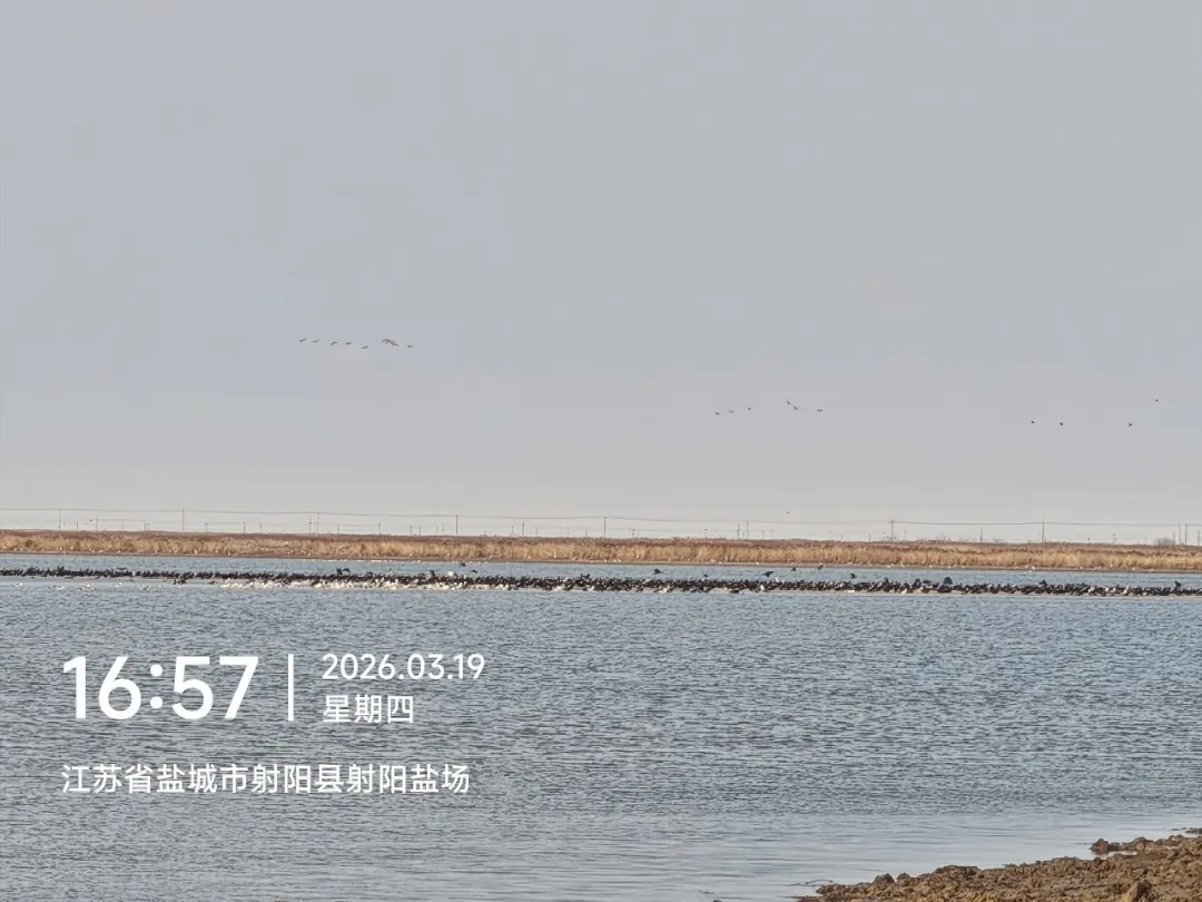 如果说城市的春是杨柳绿芽枝头绽花,那么遗产地的春则多了几分慢热,在射阳区域的巡护路上,并未见到大片的绿意,植物仿佛还在蓄力,可这并不妨碍鸟来报春:射阳盐场的水域介及上空被鸟群“点亮”,一号水库成了以普通鸬鹚和西伯利亚银鸥为主角鸟类的大型聚会现场。